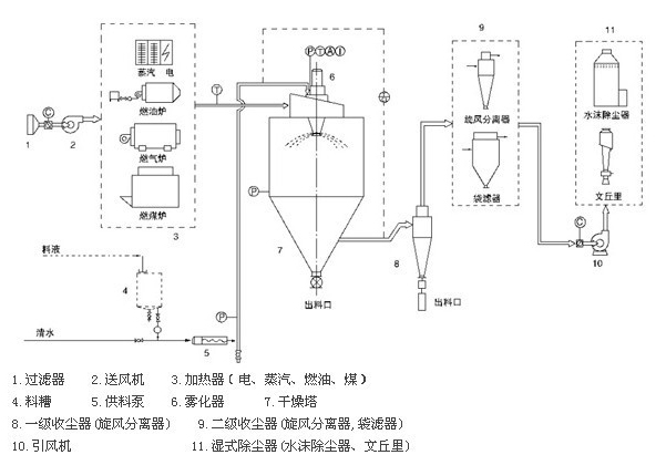 空氣通過過濾器和加熱器,進入干燥器頂部的空氣分配器,熱空氣呈螺旋狀均勻進入干燥器。料液由料液槽經過濾器由泵送至干燥器的離心霧化器,使料液噴成績效的霧狀液滴,料液和熱空氣并流接觸水分迅速蒸發,在短時間內干燥為粉末狀成品。成品由于干燥塔地步和旋風分離器排除,廢棄由風機排出。