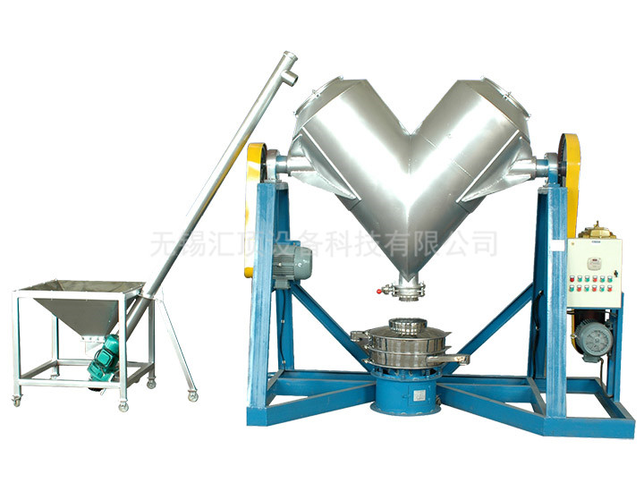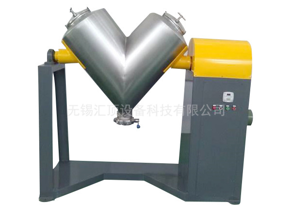 混料筒一般用不銹鋼制作,內外壁拋光,結構設計上保證無積料死角,清洗方便徹底。筒體上部有兩個進料口,下部有一個出料口。桶體可用手任意轉動,以便于出料。